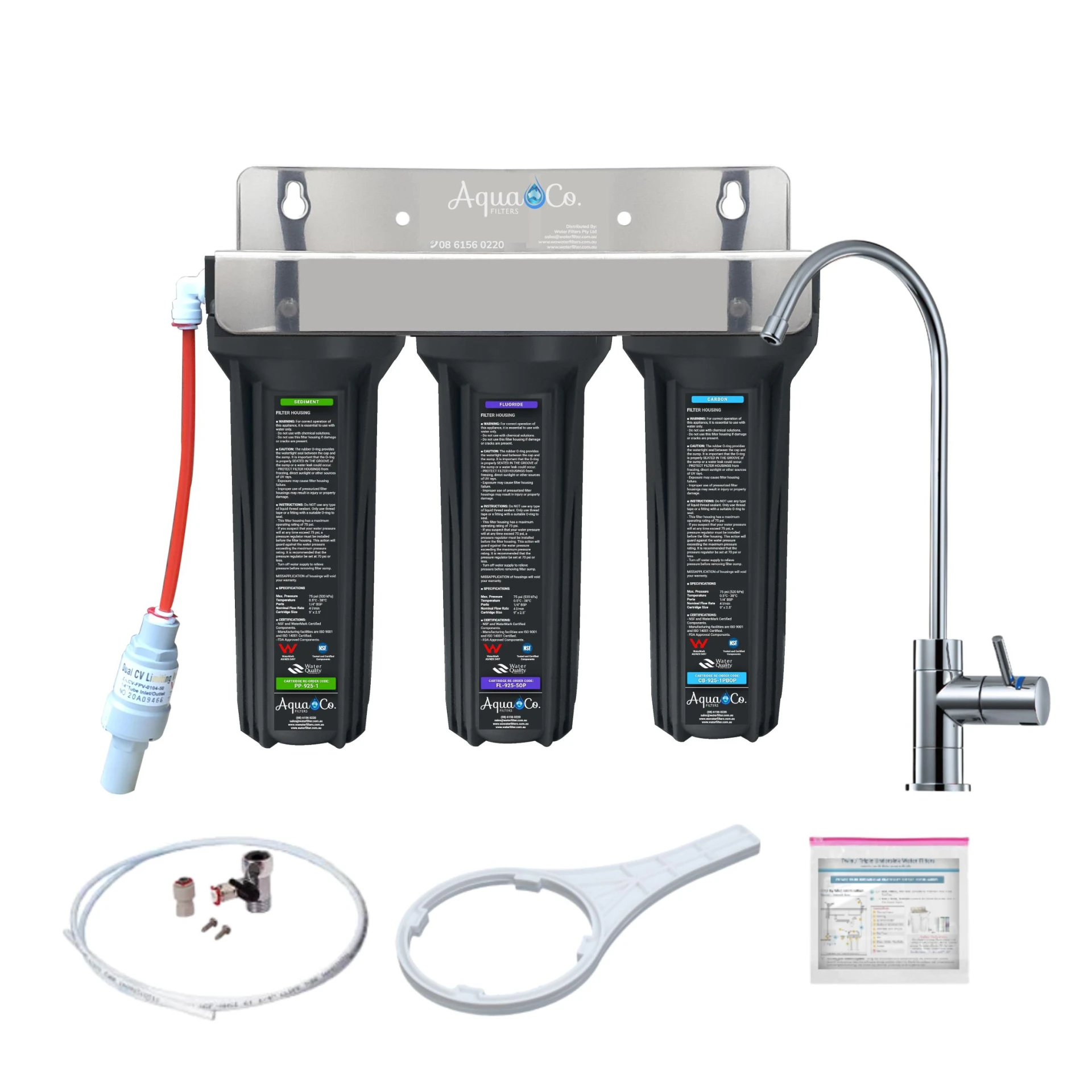 Compact 2-3 stage filtration system providing clean water right from your kitchen tap.